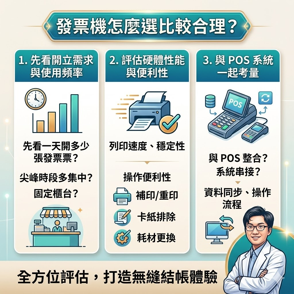 先看你的產業型態、開立頻率、是否有POS整合需求,再評估列印速度、穩定度、操作便利性與售後服務。