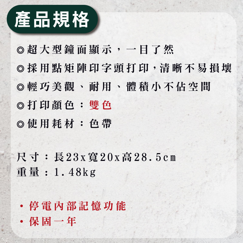 - 點矩陣列印,清晰易讀,堅固耐用